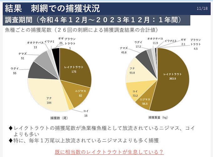 ヒメマスとレイクトラウトの両種は、国内、国外の違いはあれど移入種であることに変わりはありません。ただし、ヒメマスが社会的合意を経て放流されているのに対し、レイクトラウトは個人的な思惑から密かに放流されたであろうという大きな違いがあります。(山梨県漁連)