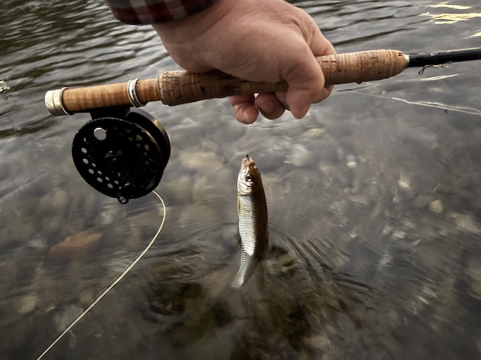 この季節、いいサイズのオイカワは小さいフライに出る。28番のクロスオーストリッチ。夏以降でいちばんたくさん数も出た。