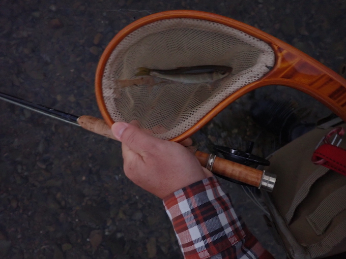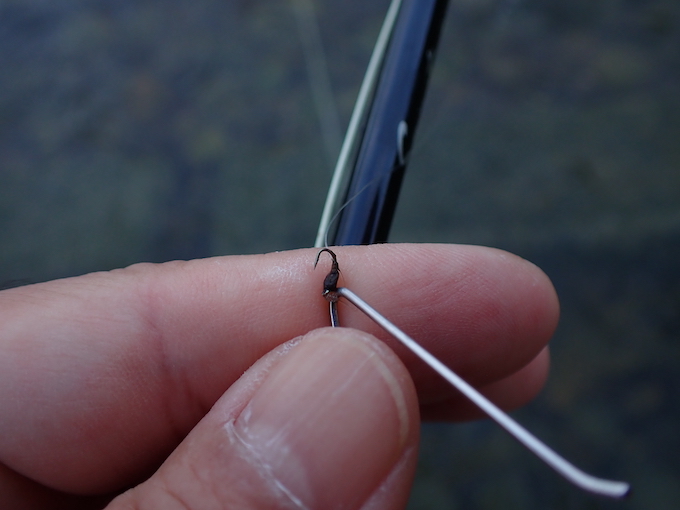 16時に釣りを始めた時は、18番のフライを結んでいた。しかし反応がにぶい。ていうかアタリがない。でも面倒だし、このままいっちゃおうかと思った。が、思い直して、ちっさいのに結びかえたところ、一投目からバンバンあたる。
