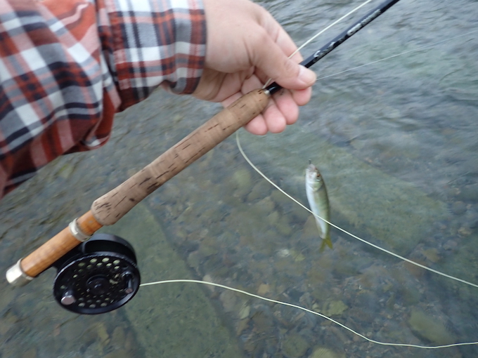 もっと小さいのも釣れたけどカメラおたおたしてたらばれた。このサイズでもフッキングするのはそれほど難しくない。難しいのはとりこみ。かけて、手元へ引っ張ってくる間に、2番のフライラインが風で揺れるだけでバレます。