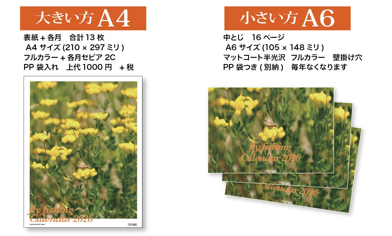 近年は世の中の趨勢で紙のカレンダーの売れ行きが悩ましいです。が、2026年も「フライの雑誌オリジナル・カレンダー」の大きい方、小さい方ともに作りました。喜んでくださる方、待ってますと言ってくださる方もいらっしゃるので、がんばりました。11月から発送します。
