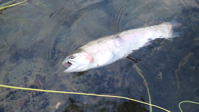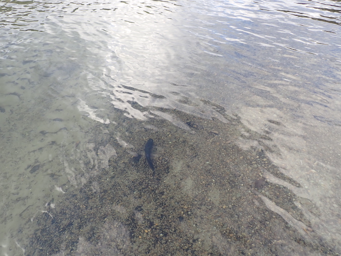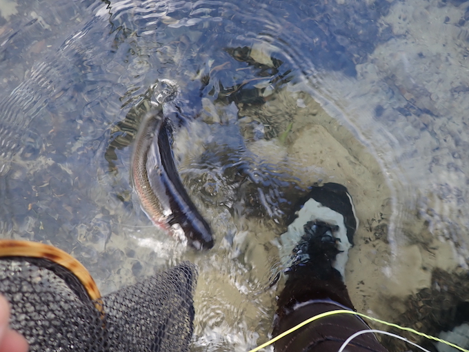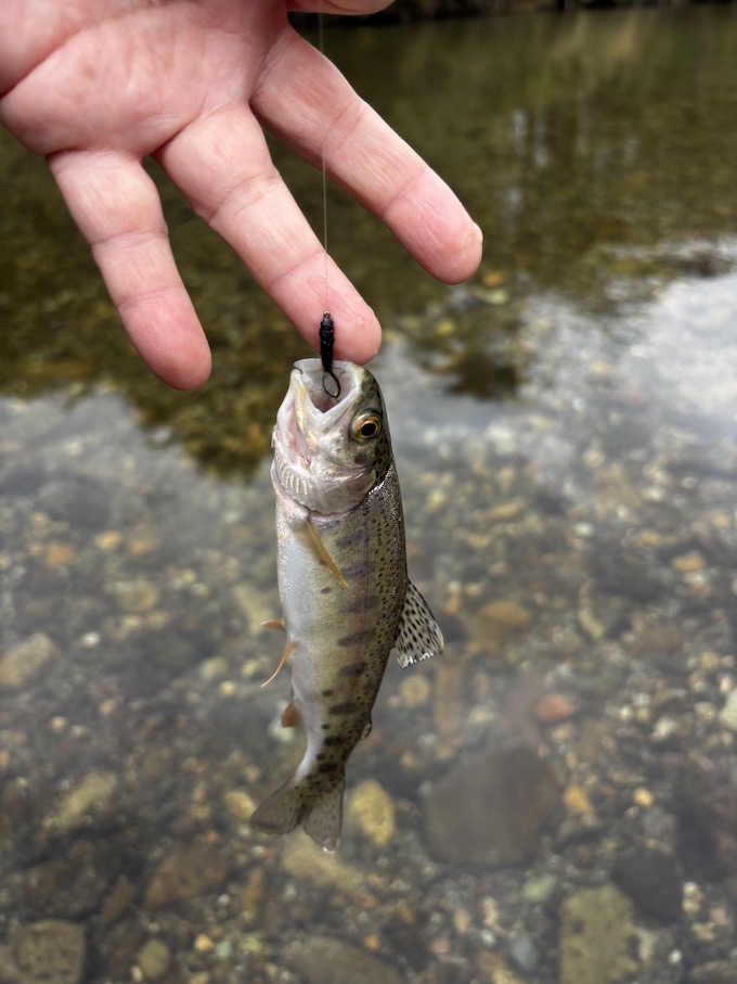 ぼーっとしているニジマスを発見。なんとなくパピーリーチを投げたらゆらっと動いて釣れてしまった。