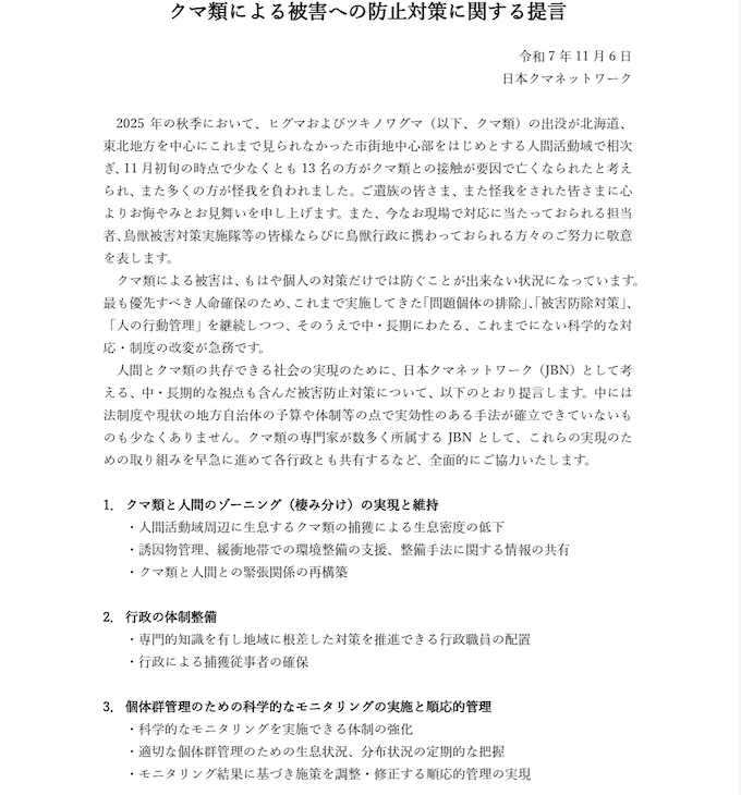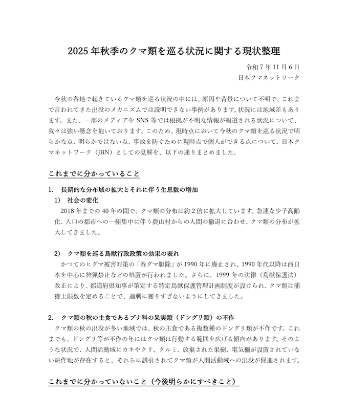 日本における人間とクマ類との共存をはかるために作られたNGOである日本クマネットワーク(JBN)が、「クマ類による被害への防止対策に関する提言」および「2025年秋季のクマ類を巡る状況に関する現状整理」を公表。