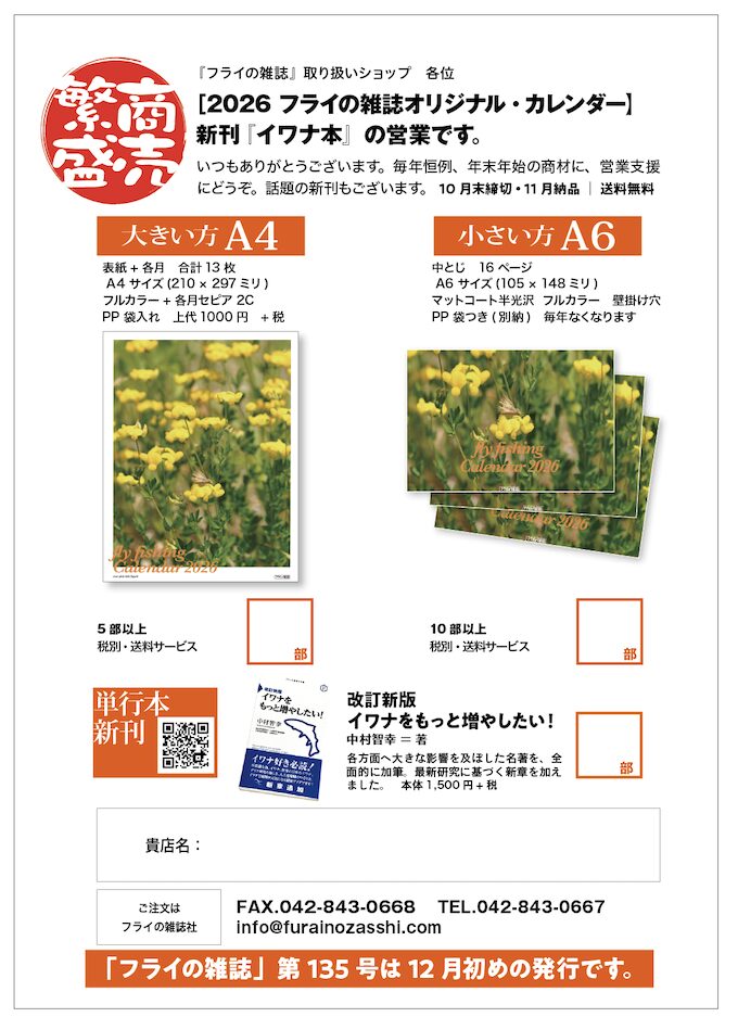 「2026フライの雑誌オリジナルカレンダー」(大きい方)、完成しました。カバー写真は田口清輝さんです。きれい!