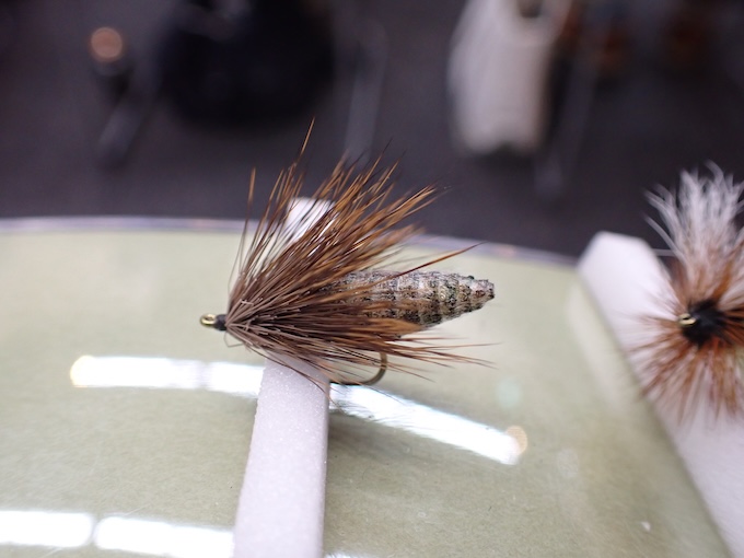 井上さんの夏の釣り上がりフライその2。キモゼミと同じ島崎憲司郎さん開発のシマザキ・ダイレクト・ホロー・ボディの発想で作った渓流フライ。絶対不沈艦。10番くらい。イワナに効きます。これは釣れそう。