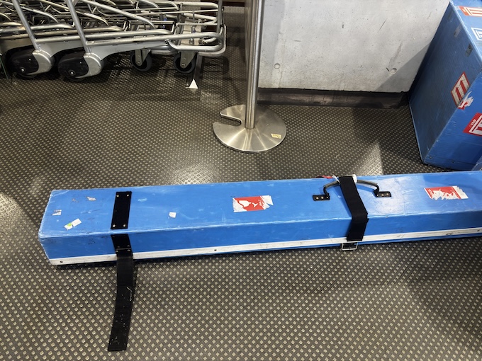 飛行機釣り派にはおなじみの「長尺ものの青い箱」。全日空では今年一月で廃止です。今後は各自で運べるように梱包しておく必要があります。