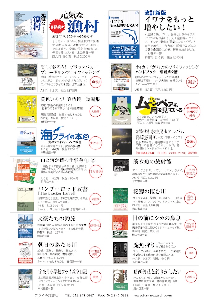 「フライの雑誌」の最新号は昨年12月10日刊行の第135号です。最新単行本は昨年刊行の『改訂新版 イワナをもっと増やしたい!』と『元気な漁村 海を守り、にぎやかに暮らす』です。