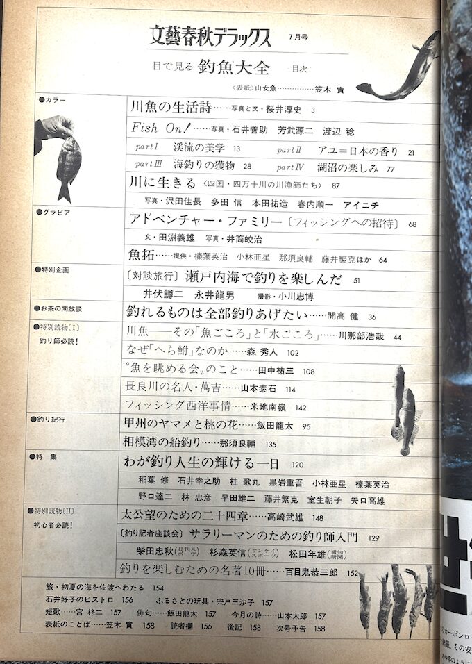 魚雷さんからは「文藝春秋デラックス 目で見る釣魚大全」を手渡された。1975年刊。恥ずかしながらこれは知らなかった。すごい目次。長年疑問だった、とある案件の元ネタがまさにこの本の記事に載っていた。何という出会い、ラッキー。古本すごい。今夜ペリカン時代さんに来てよかった。読み込みます。