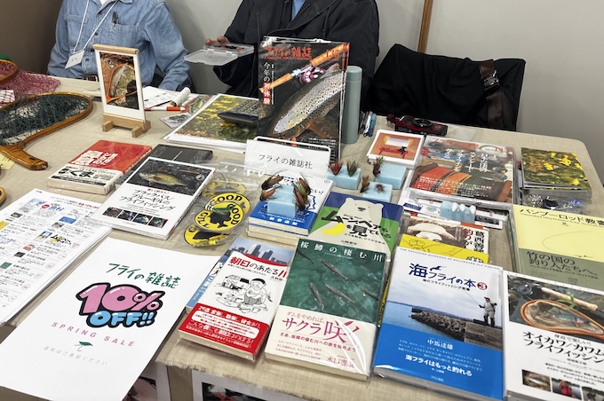 単行本を中心に並べてみました。135号がたくさん売れました。キモゼミを記事で読んだんだけどうまくいかないという方に井上師匠が直接コツを伝授したり、20本巻いてこんなになったよ、という方(すげえ完璧な写真を見せてくれました)、フライって面白いんですね、というテンカラ女性の方、寄ってくださったみなさん喜んでくれて嬉しいです。