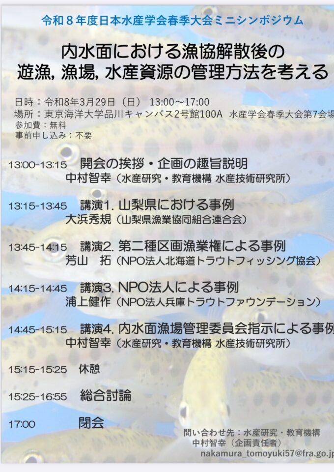 3.29海洋大、日本水産学会ミニシンポジウム「内水面における漁協解散後の遊漁、漁場、水産資源の管理方法を考える」。